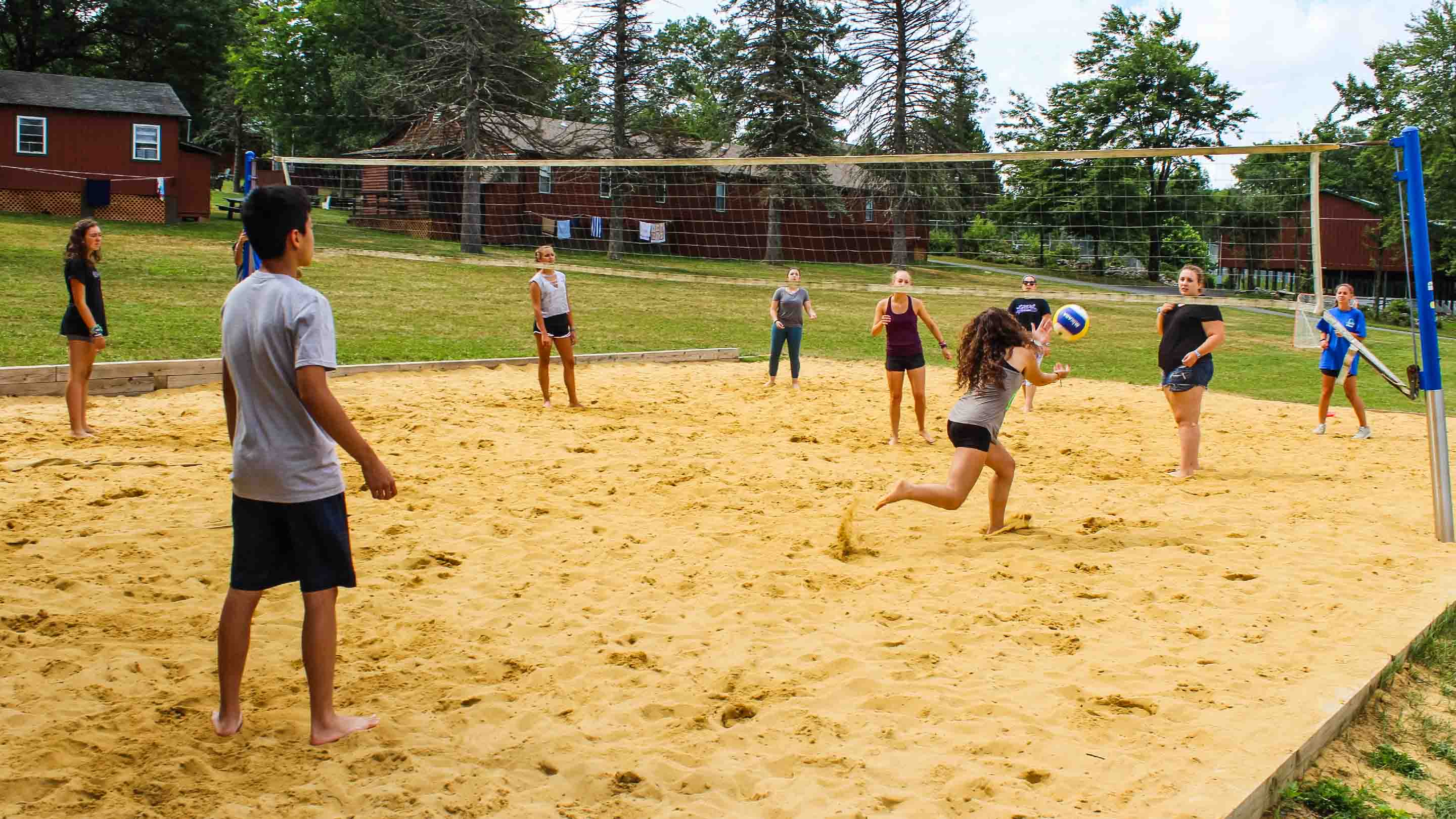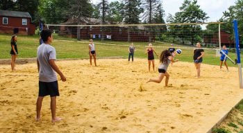 Our sand volleyball court is the perfect home to our volleyball program. Younger campers begin with newcomb, which is a lead up game to volleyball. Older campers engage in full games as well as smaller group tournaments. Leading up to games and tournaments, campers learn proper positioning, serving, setting and hitting.