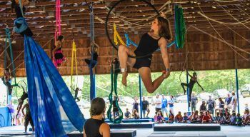 Swing, twist and swoop! Lyra is a suspended aerial hula hoop where campers can hang, twist, spin and sit in the hoop in a variety of poses. Lyra can be used for both solo acts and two camper acts and the tricks that are performed are very similar to the static trapeze acts.