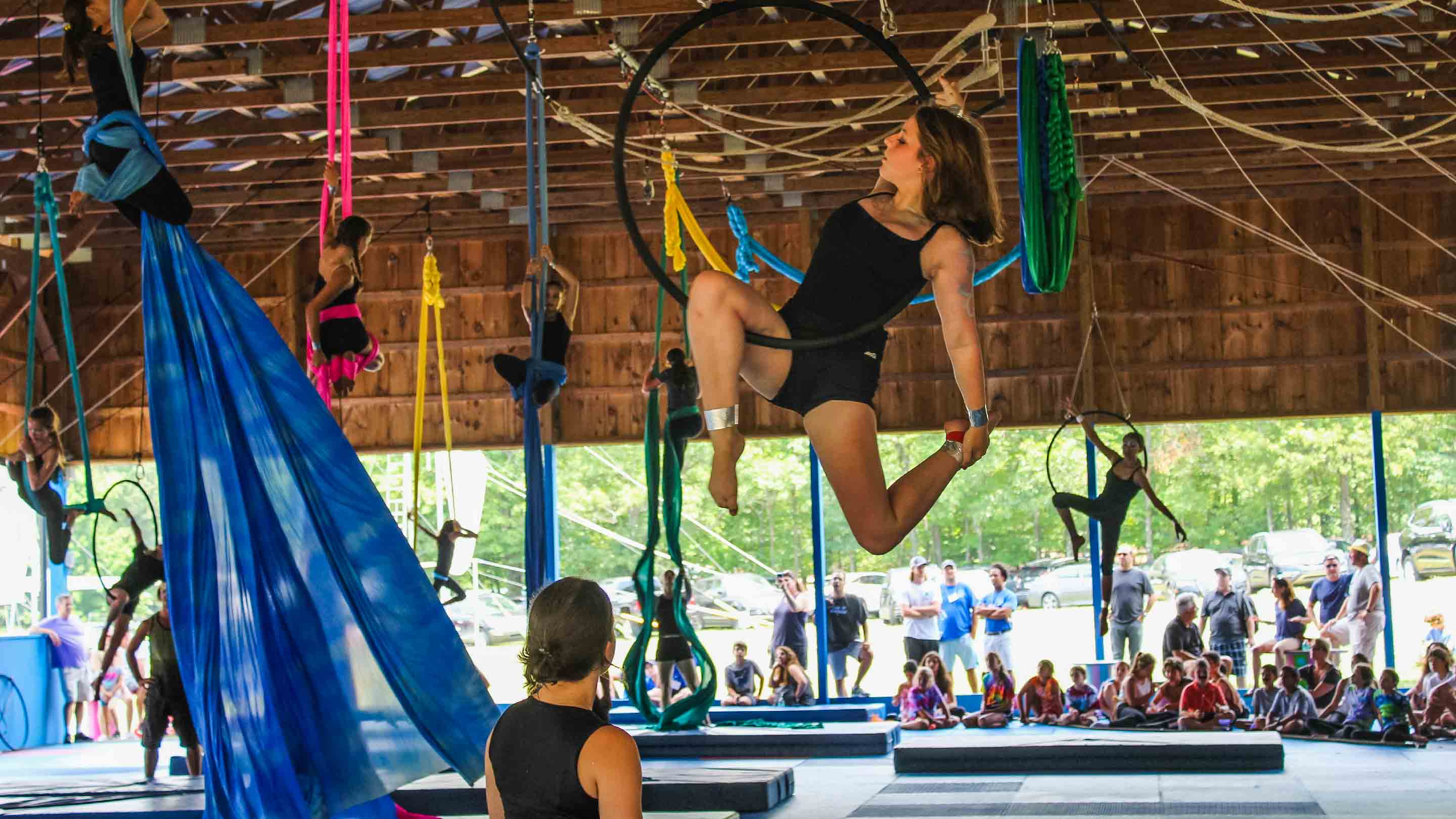 Join the wonderful world of silks, where campers can hang and perform acrobatics on special fabrics. Our professional circus staff teaches our campers how to climb the silks and tie knots with their feet and arms. Campers use the fabric to wrap, suspend and spiral their body into and out of various positions.